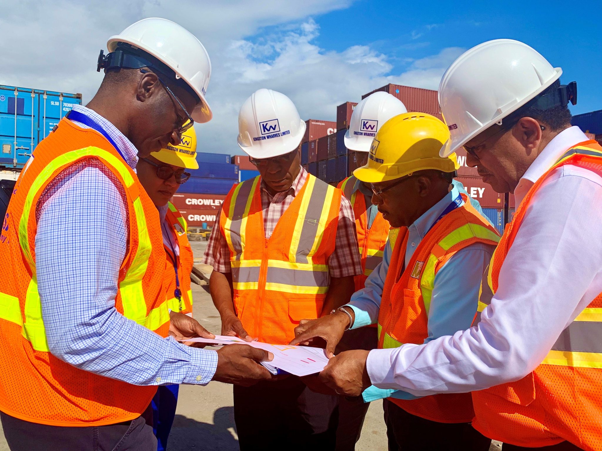 Looking over plans: Officials of Kingston Wharves, National Works Agency and the Shipping Association of Jamaica, look over plans for the drainage constructions works underway on a section of Port Bustamante, Newport West. The works, which are over 90 percent complete, are being funded by Kingston Wharves to the tune of $100 million. KWL’s CEO Grantley Stephenson (right) and NWA’s CEO E.G. Hunter (third Left) were among those present. Others from left are, KWL’s Chief Operating Officer Mark Williams, Group Chief Financial Officer Clover Moodie; Director of Regional Implementation and Special Projects at NWA Varden Downer, SAJ’s Executive Director Trevor Riley (not pictured) and KWL’s Facilities Manager Michael Arbouine.